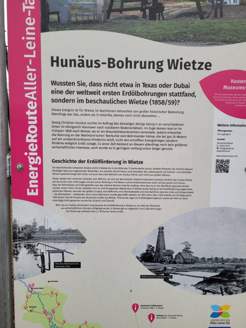 Im 20 km westlich von Celle gelegenen Ort Wietze begann bereits 1858 die industrielle Förderung von Erdöl, deren Anfänge bis in das Jahr 1652 zurückreichen. Hier wurde die wahrscheinlich erste Erdölbohrung der Welt durchführt - bis heute erinnert das Deutsche Erdölmuseum nahe dem Ortskern an diese spannende Zeit.